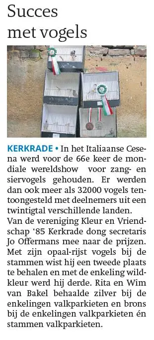 In 2018 werd W.J Offermans op de Wereld kampioenschappen in cesena Italië met stam opaal rijstvogels 2de en bij de enkelingen wildkleur 3 de.